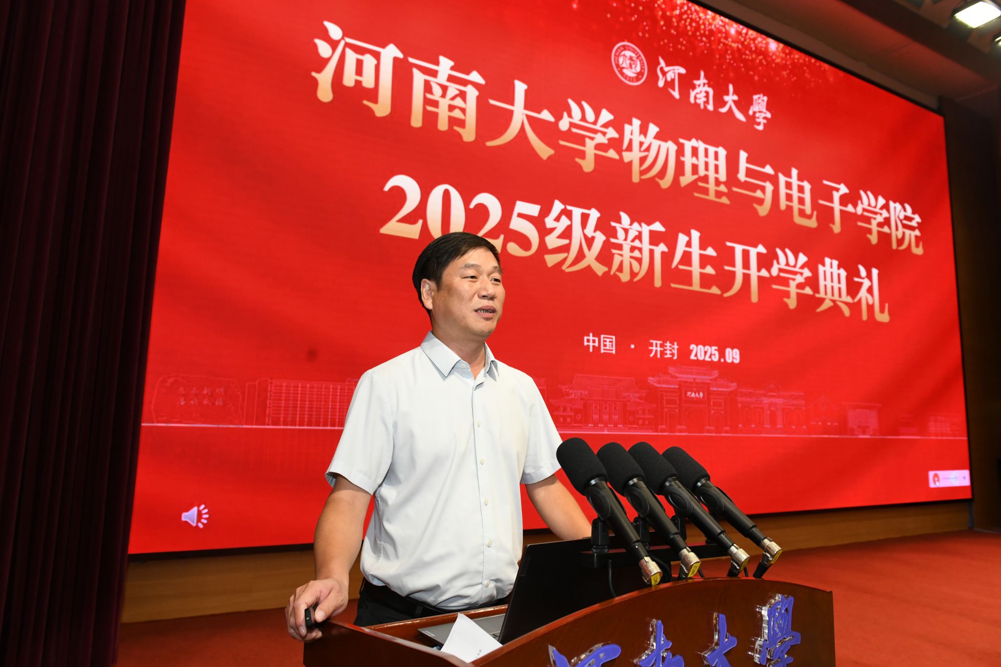 典礼结束后,学院党委书记张慧以《坚定信念 志存高远 以青春之我勇当时代先锋》为题,为全体新生讲授开学第一堂思政课。他围绕伟大建党精神、抗战精神、“两弹一星”精神、红旗渠精神、改革开放精神等中国共产党人精神谱系,结合学校百年办学历史和学院发展实际,引导新生深刻理解个人成长与国家命运、民族复兴之间的紧密联系。他鼓励新生以“自信、拼搏、开放、创新”的新河大精神为指引,胸怀“国之大者”,在学习实践中锤炼过硬本领、在创新发展中勇担时代使命,将青春奋斗融入党和人民事业,为实现中华民族伟大复兴贡献智慧与力量。