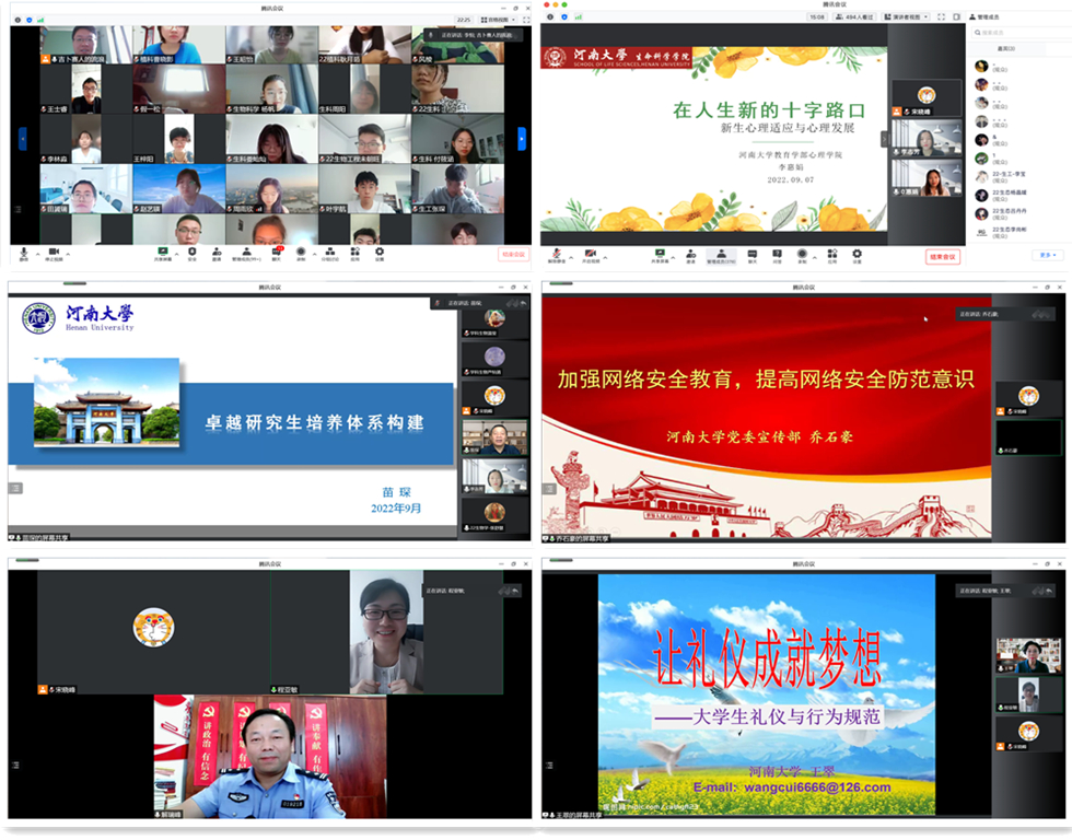 在“幸福篇”中,心理适应、安全教育、国际视野、劳动价值、网络文明等主题教育引导新生理解幸福、创造幸福、传递幸福,以主人翁姿态共建共治共享幸福生科、幸福河大。保卫处党总支书记潘少奇以“增强安全意识,护佑美好人生”为题,为学生作校园安全知识讲座;党委统战部副部长于红英作了题为“铸牢中华民族共同体意识”的专题报告;党委宣传部副部长乔石豪以“加强网络安全教育,提高网络安全防范意识”为题,引导新生做到“安全上网,文明上网”;国际合作与交流处副处长王芃围绕国际化教育的内容和案例,引导学生加强学习,打开视野,为个人发展创造更多机遇;教育学部心理学院李慧娟以“在人生新的十字路口”为题,为新生讲解如何做好心理适应、压力管理与心灵加油;开封市公安局顺河分局宋门派出所所长解瑞峰结合多年实战工作经验,以数十个真实案例,引导新生了解各类安全风险、防范和化解社会风险。