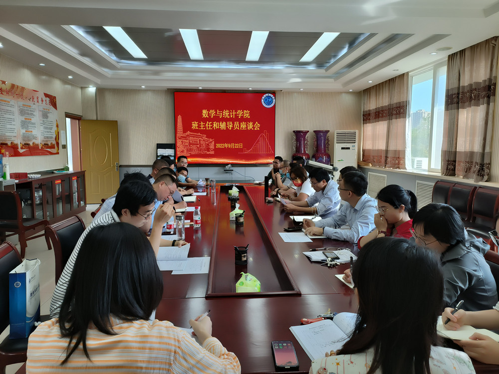 为扎实高效推进学生管理教育工作,进一步提升学院“三全育人”成效,9月22日下午,数学与统计学院于二楼会议室召开班主任和辅导员座谈会,学院党委书记史富强,院长韩小森,党委副书记赵红磊,副院长解俊山、唐恒才,各系主任,全体班主任和辅导员参加座谈会。会议由解俊山主持。