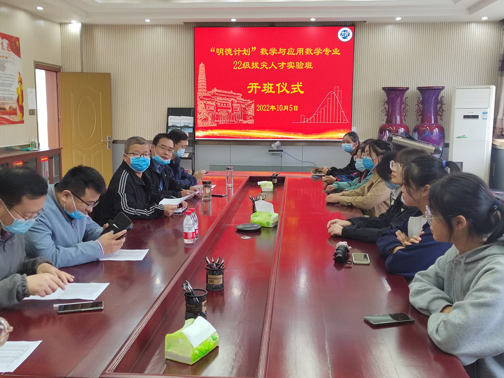 10月5日上午,数学与统计学院2022级“明德计划”数学与应用数学拔尖人才实验班开班仪式于学院二楼会议室举行。院长韩小森、院党委副书记赵红磊、副院长解俊山、实验班班主任刘根强,实验班导师代表龚克、陈敏茹、乔少霞,2022级辅导员吴苏苏和25位实验班同学参加仪式。会议由解俊山主持。