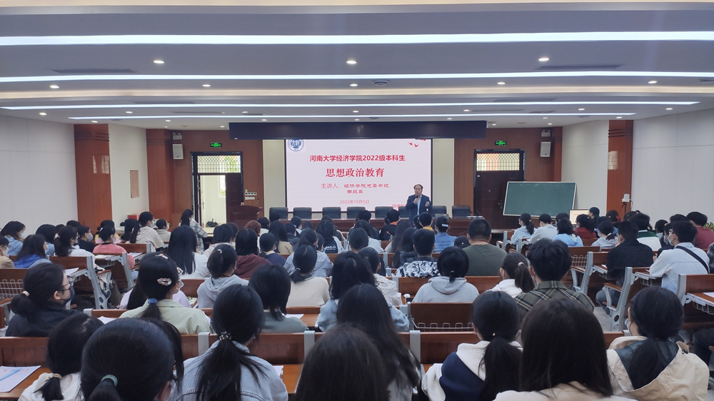 10月5日上午,经济学院党委书记田歧立在学院二楼报告厅为2022级全体本科新生上思想政治教育课,学院2022级共330名本科新生通过线上、线下相结合的方式聆听了课程。