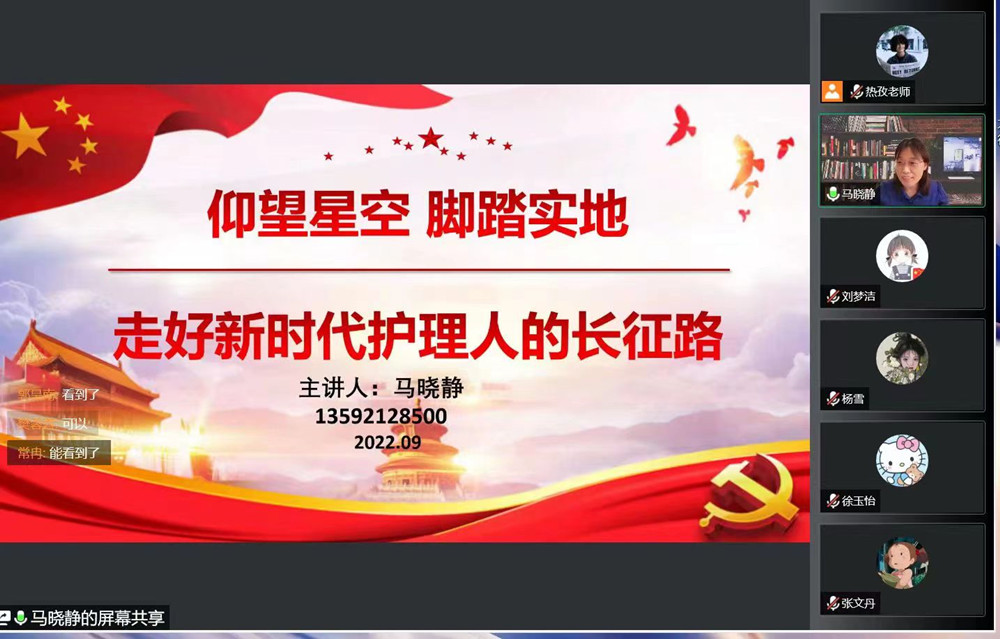 9月4日上午,为引导2022级本科新生正确认识“小我”和“大我”,激励同学们将荣校、爱国、报国作为奋斗目标,护理与健康学院党委书记马晓静为2022级新生作题为《仰望星空脚踏实地——走好新时代护理人的长征路》的讲座,全体2022级本科新生线上参会,会议由2022级本科辅导员热孜万古丽·黑木都老师主持。